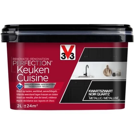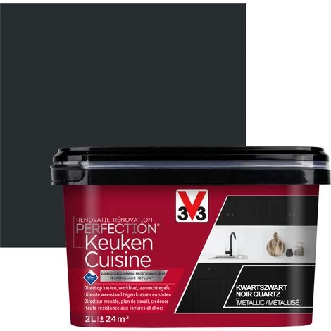 La peinture cuisine V33 RĂ©novation Perfection noir quartz mĂ©tallisĂ© 2L s’applique sur les meubles de cuisine, crĂ©dences, plans de travail et Ă©lectromĂ©nagers, neufs ou anciens et ce quel que soit leur matĂ©riau tels que le bois brut, vernis ou peint, le mĂ©laminĂ© ou stratifiĂ©, le carrelage murau, plâtre, verre, plastique et mĂ©tal. La technologie TeflonTM empĂŞche aux taches d’adhĂ©rer, pour une rĂ©sultat parfait et durable. Comptez 6h entre 2 couches et 24h pour un sĂ©chage complet Ă©vitant ainsi les catastrophes. La peinture sera nettoie aisĂ©ment Ă l’eau. Quel bonheur de cuisiner dans une aussi belle cuisine !