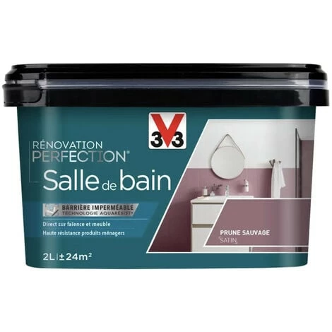 Peinture Salle de Bain V33 Rénovation Perfection Prune sauvage a été spécialement conçue pour rénover durablement les supports et matériaux très sollicités. Changez la couleur de vos faïences ou meubles de salle de bain grâce à la Peinture Salle de Bain V33 Rénovation Perfection. Ultra-adhérente et imperméable, elle fait barrière contre les projections d’eau et l’humidité sans bouger. HAUTE ADHERENCE: Même en milieu humide HAUTE RÉSISTANCE: Ne s’écaille pas malgré les écarts de température FACILE À VIVRE . Ultra lessivable au quotidien . Résiste aux produits d’entretien et aux cosmétiques